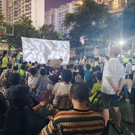 露天播放電影的形式,自由隨意的觀影氣氛,讓觀影人員更真切的體驗(yàn)艱苦奮斗的那個(gè)年代,革命先輩的付出與奮斗。放映活動(dòng)現(xiàn)場(chǎng)反響熱烈,夜幕降臨,現(xiàn)場(chǎng)座無虛席。業(yè)主們有的自帶板凳、有的駐足站立、有的直接席地而坐。物業(yè)工作人員精心布置著場(chǎng)地,還為業(yè)主準(zhǔn)備觀影小零食,業(yè)主們嗑著瓜子、吃著冰棍,都全神貫注地融入到劇情里,仿佛身臨其境。