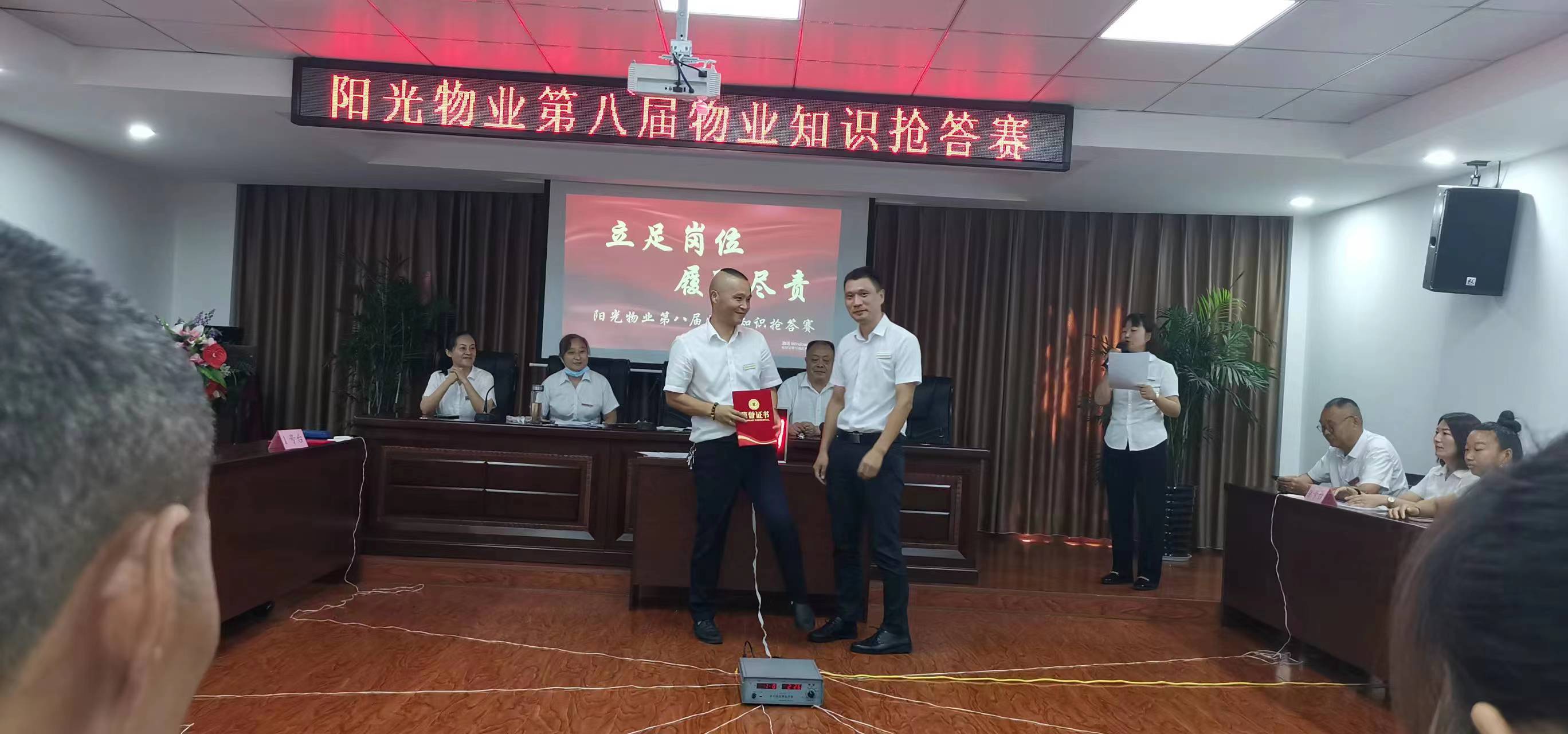 在大家共同的協(xié)調和配合下,陽光物業(yè)第八屆物業(yè)管理知識搶答賽取得圓滿成功?;顒蝇F(xiàn)場掌聲雷鳴,充滿了歡快熱鬧的氣氛,各參賽隊積極參與,主持人風趣幽默,現(xiàn)場井然有序,笑聲不斷。比賽由必答題、搶答題、風險題、觀眾答題四個環(huán)節(jié)組成。經(jīng)過一番激烈的競爭,最終由仙源保障房、廉租房組合的完美隊取得第一名,由廣德花苑、陽光鑫都組合的輝煌隊獲得第二名,總部和公園壹號組合的葵花隊取得了第三名,陳勇同志以答對9題的優(yōu)異成績脫穎而出獲得優(yōu)秀答辯手獎項。